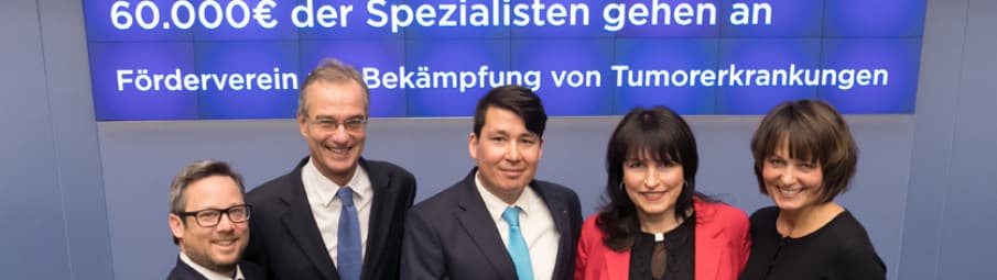 Die Deutsche Börse und die auf dem Frankfurter Parkett tätigen Spezialisten haben am 15.12.2017 im Börsensaal die Spendenerlöse der Aktion 'Trading Charity - Handeln und Helfen' bekanntgegeben. Insgesamt sind durch die Aktion 135.000 Euro zusammengekommen. Davon spendet die Deutsche Börse 75.000 Euro an den Verein Hilfe für krebskranke Kinder Frankfurt e.V. und die Spezialisten 60.000 Euro für den Frankfurter Förderverein zur Bekämpfung von Tumorerkrankungen (FFBT) e.V. Die Vertreter der beiden Organisationen durften im Anschluss an die Übergabe den Handel im Frankfurter Börsensaal mit der traditionellen Handelsglocke eröffnen.