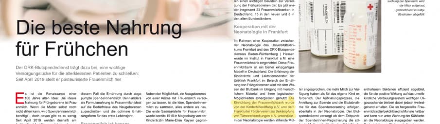 It is the renaissance of a 100-year-old idea: the ideal food for newborns is women's milk. If the mother herself is not yet able to breastfeed, donor breast milk is needed - but there is not enough of it. Since April 2019, women's milk donations have therefore been collected, portioned and pasteurized at the Frankfurt Institute of the German Red Cross Blood Donor Service. The establishment of this women's milk bank was supported by the Frankfurter Förderverein zur Bekämpfung von Tumorerkrankungen (FFBT) e.V., among others. A change in the statutes enabled the FFBT to participate in this important institution.