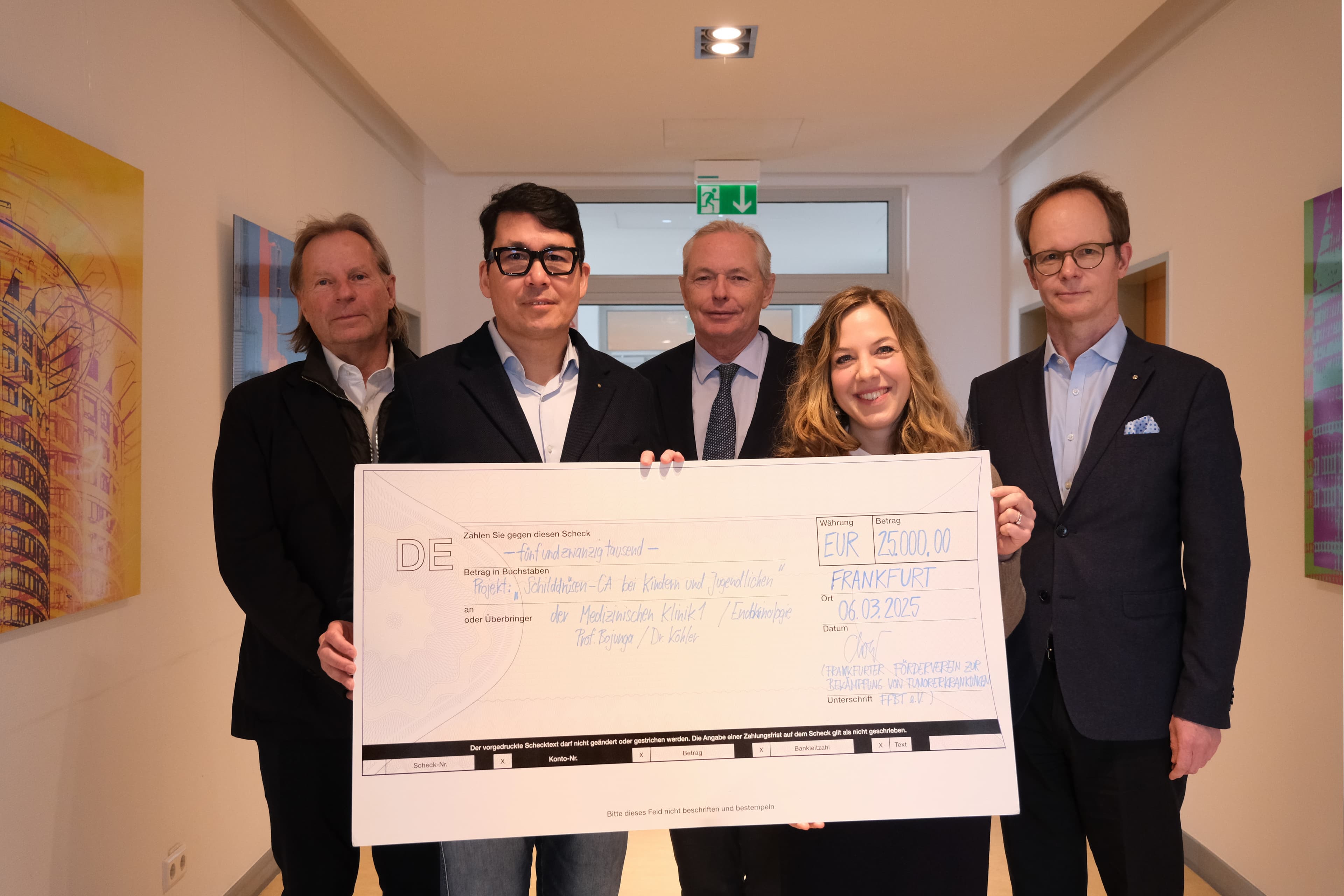 The Frankfurter Förderverein zur Bekämpfung von Tumorerkrankungen (FFBT) e.V. has handed over a cheque for 25,000 euros to Medical Clinic 1 at Frankfurt University Hospital. The funds will go towards a project focusing on molecular genetic analyses to improve diagnosis and treatment options for children and adolescents with thyroid cancer.