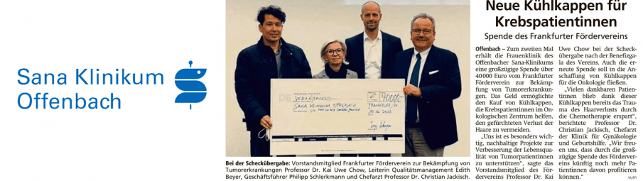 For the second time, the women's clinic at Offenbach's Sana Clinic has received a generous donation from the FFBT: 40,000 euros will enable the purchase of cooling caps to help cancer patients at the Oncology Center avoid the dreaded loss of hair. FFBT board member Prof. Dr. Kai Uwe Chow presented the cheque, the Offenbach-Post reported on 13.12.2022.